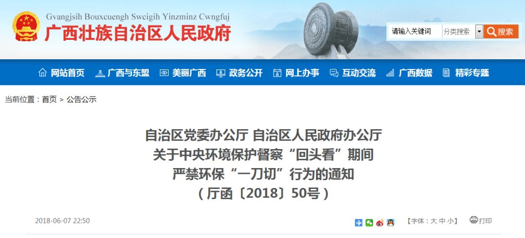 2018年6月7日广西发布关于中央环境保护督察“回头看”期间 严禁环保“一刀切”行为的通知 (厅函〔2018〕50号),明确提出: