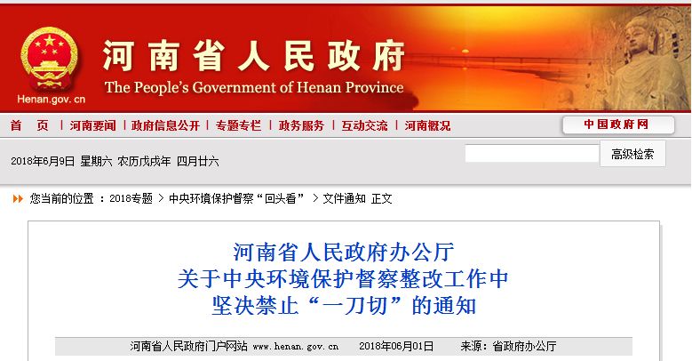 2018年6月3日河南省人民政府办公厅关于中央环境保护督察整改工作中坚决禁止“一刀切”的通知: