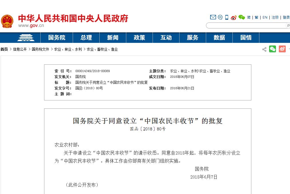 国务院近日公布了关于同意设立“中国农民丰收节”的批复。批复指出:关于申请设立“中国农民丰收节”的请示收悉,同意自2018年起,将每年农历秋分设立为“中国农民丰收节”。具体工作由农业农村部商有关部门组织实施。